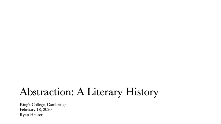 Thanks for coming. In this talk I’ll give a general overview of my research project on “abstraction,” which focuses specifically on the history of abstract language in literature, and especially the novel.