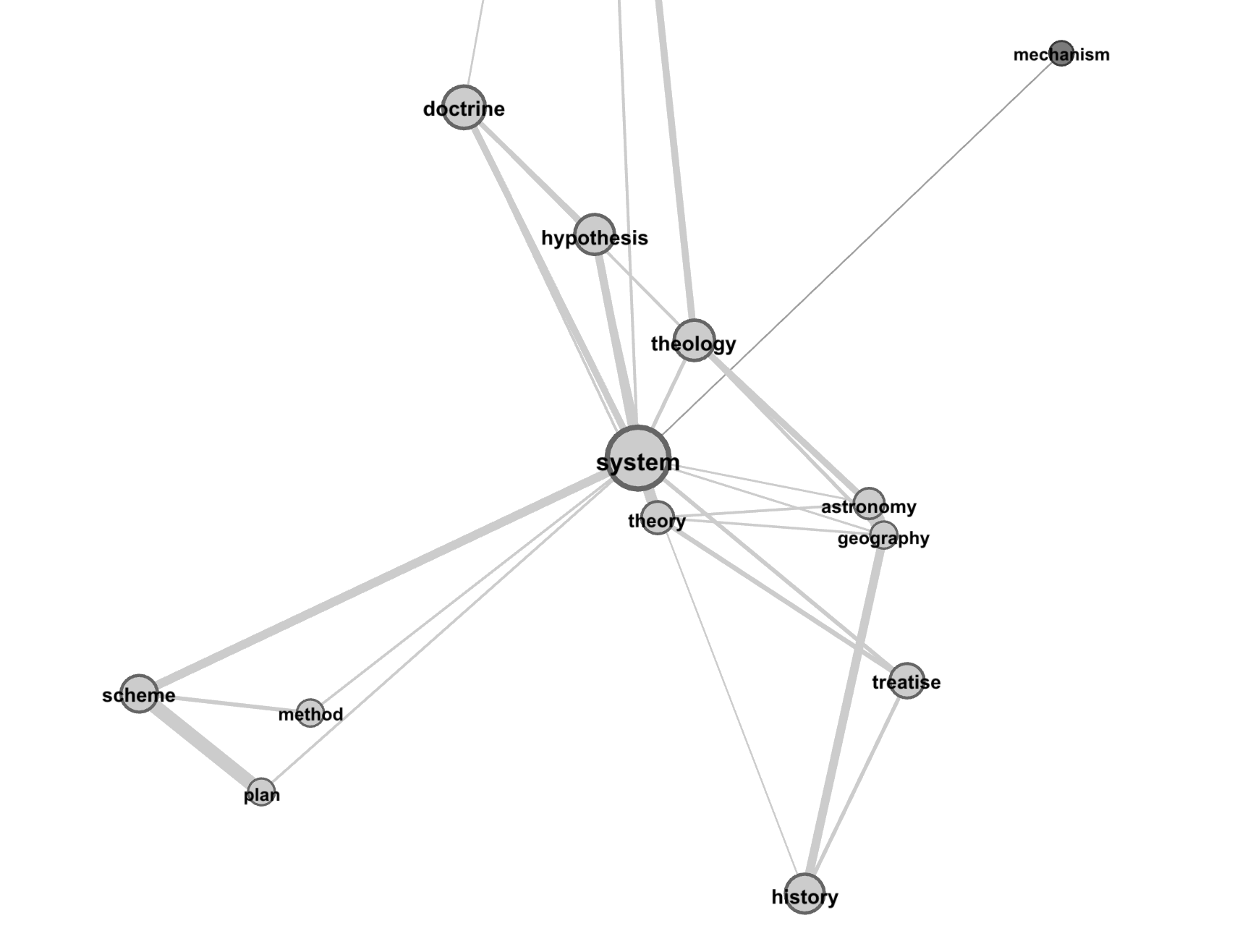 What are semantic networks? Are they more than a convenient way of exploring semantic relationships in the vector-space? I think so. Networks capture something intuitive about the associative way in which we relate ideas—an associationism that, incidentally, derives historically from the empiricism of Berkeley and Hume. Two words, even if not quite synonyms of each other, need only be associated for them to be "stored" in a similar space in the brain, whether human or artificial. These networks, built from such associations, might be thought of as networks of "slant synonymy": an apt metaphor, given that words are linked only if the angle between their semantic vectors is not too big. Our experiments here, with hubs and bridges and betweenness centrality, also bring out the way in which certain words might be central or crucial to that process of association—especially within specific syntactic-semantic domains like abstract singular nouns. Like word vectors themselves, the methodological framework of semantic networks makes visible historically-situated structures and configurations of words and meanings.